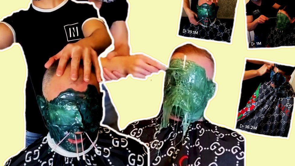 But a more recent example, with more than 19 million views, shows the wax resin coming down over a man’s chin and on to his neck.